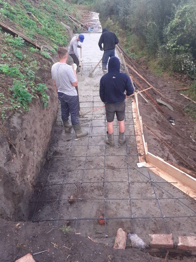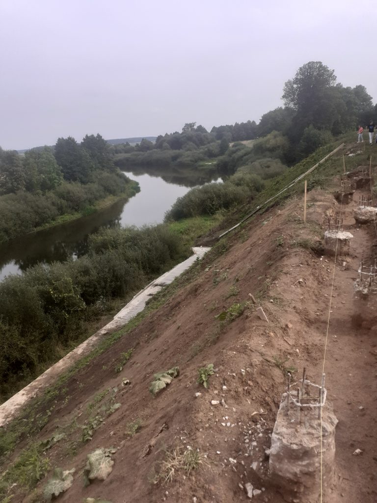 Ремонт подпорной стены, которая в своей верней части в начале 19 века была выполнена в форме усеченной пирамиды. Отремонтировано 13 погонных метров, объем бетонирования с бутом – 17 куб.м. Всего уже отремонтировано 60 погонных метров (65%) подпорной стены.