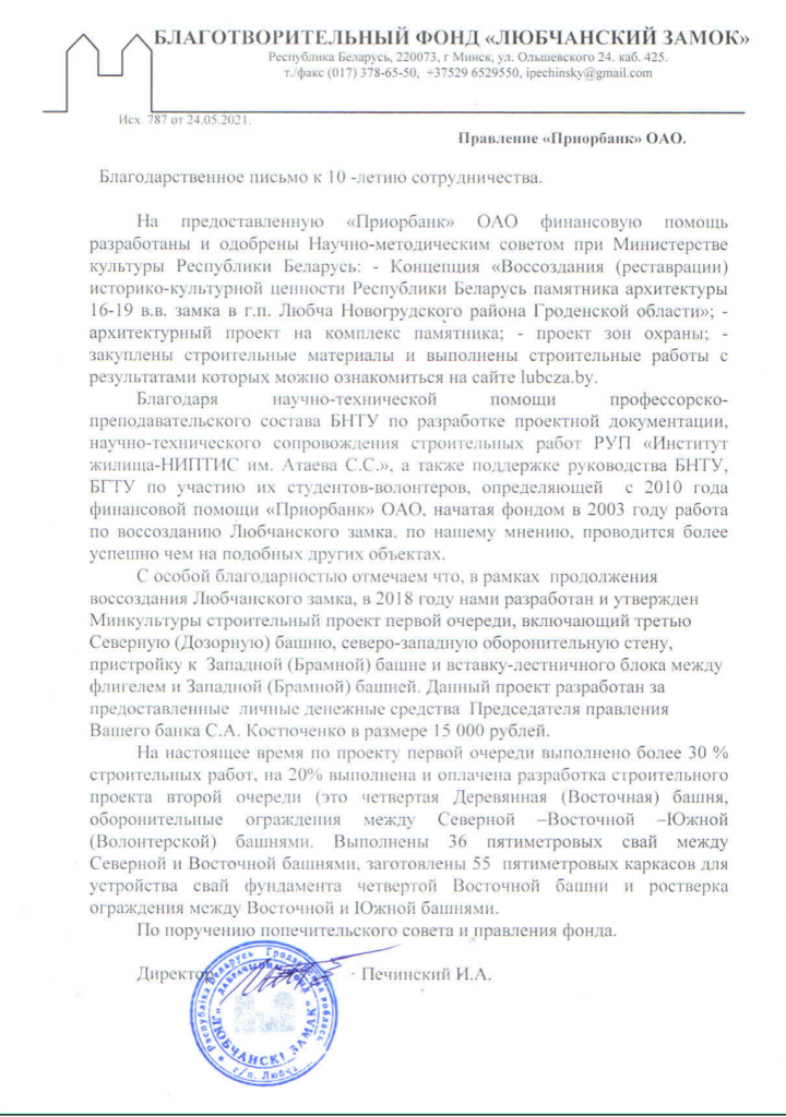 — распрацоўцы будаўнічага праекта першай чаргі, ў якую ўваходзяць аднаўленне трэцяй Паўднёвай вежы, абарончай сцяны ад яе да Брамнай вежы і ўстаўкі лесвічнага блоку паміж Брамнай вежай і флігелем. Будаўнічы прект быў разгледжаны і ўхвалены навукова-метадычнай радай па пытаннях гісторыка-культурнай спадчыны пры Міністэрстве культуры Рэспублікі Беларусь.