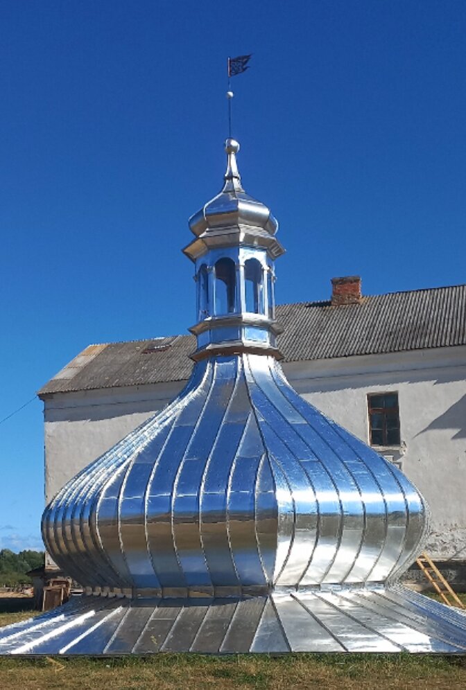 2022 г. Завершаны аблiцовачныя працы і зборка купала, выкананы кантрольны падъем, у зборцы вага купала 5 тон.