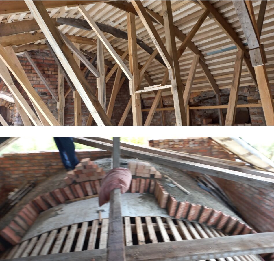 Выкананы лекала і апалубка лясоў, выраблены арочны цагляны склеп, выкарыстана 3000 цаглін, вага аркі больш за 17 тон. Зняты ўтрымоўваючая канструкцыя апалубкі лясоў. Лекала і падшыўка лёгка здыімецца ў 2023 г. Аналагічны склеп намі выкананы ў падвальным памяшканні гэтай вежы ў 2020 г.