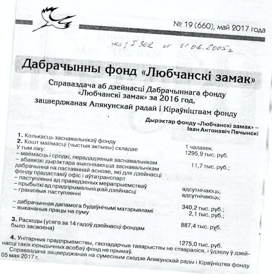 Справаздача аб дзейнасці Дабрачыннага фонду ‘Любчанскі замак’ за 2016 год.