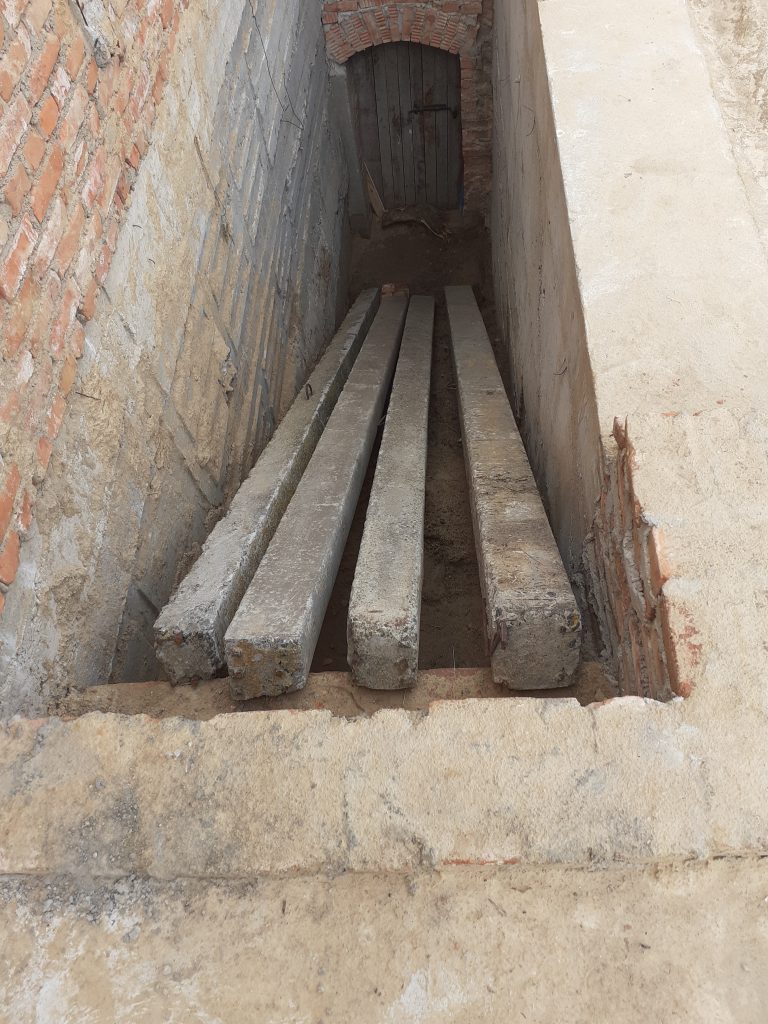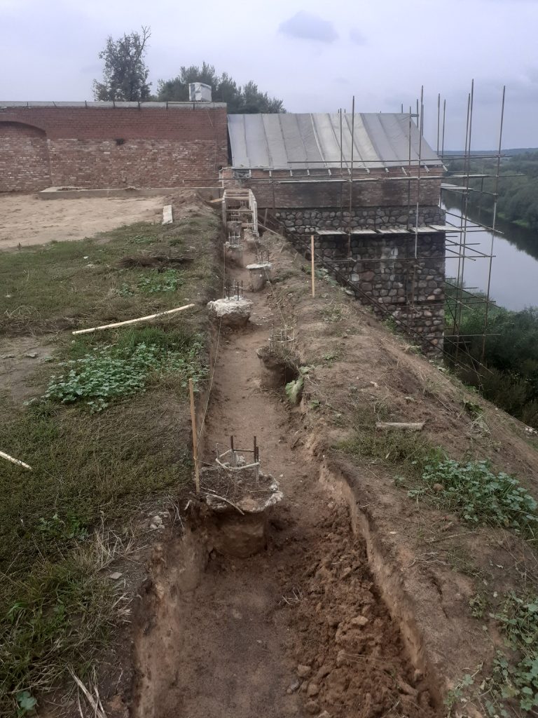 Ремонт подпорной стены, которая в своей верней части в начале 19 века была выполнена в форме усеченной пирамиды. Отремонтировано 13 погонных метров, объем бетонирования с бутом – 17 куб.м. Всего уже отремонтировано 60 погонных метров (65%) подпорной стены.