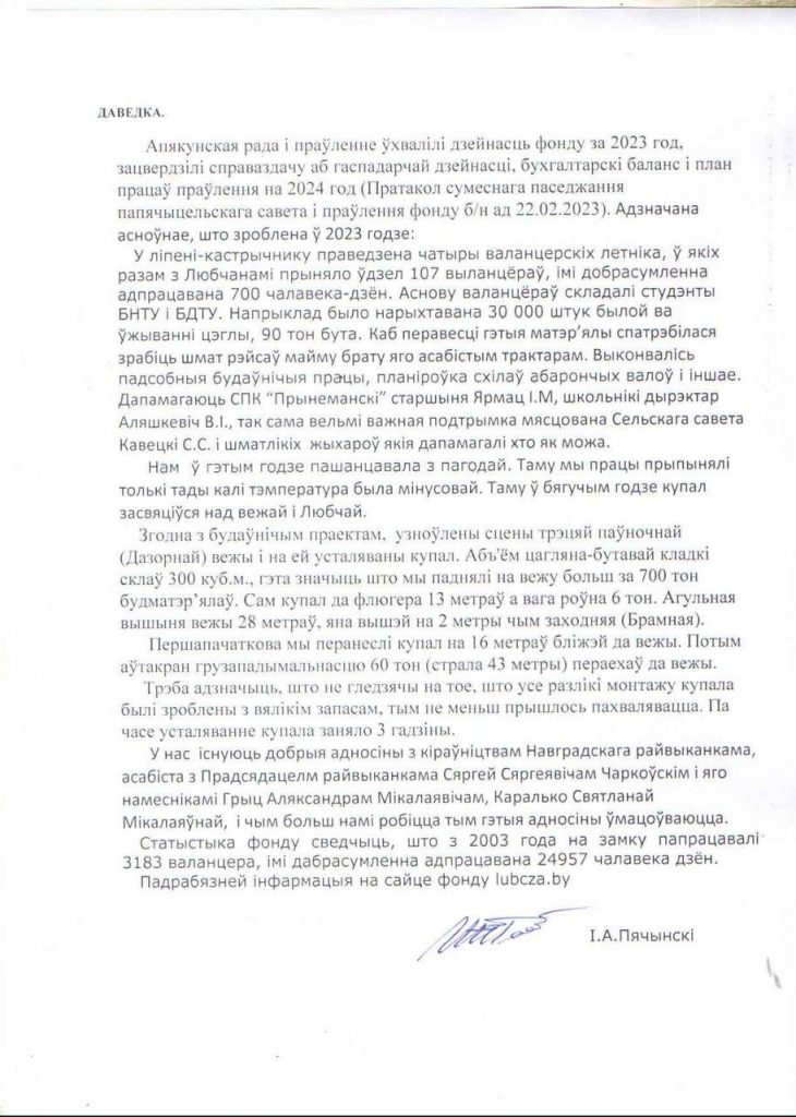 Справаздача аб дзейнасці Любчанскага замку за 2023 год.